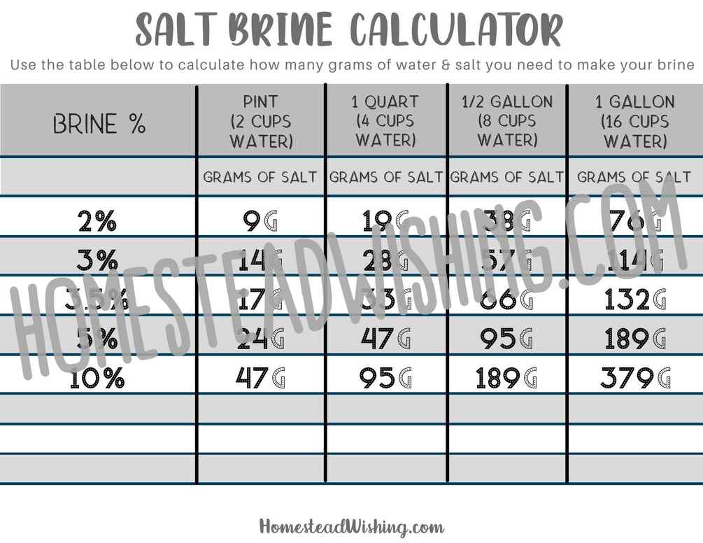 Use the Salt Brine Calculator to help you figure how just how much salt you need to make a brine. This brine calculator only works with extra fine sea salt.